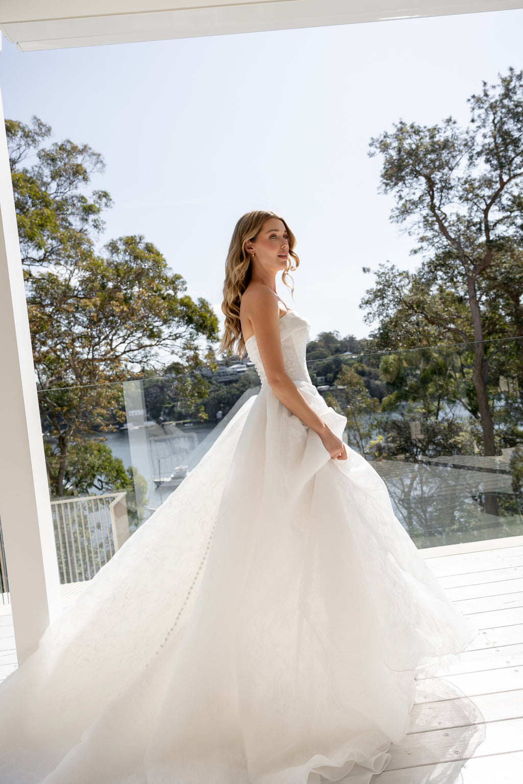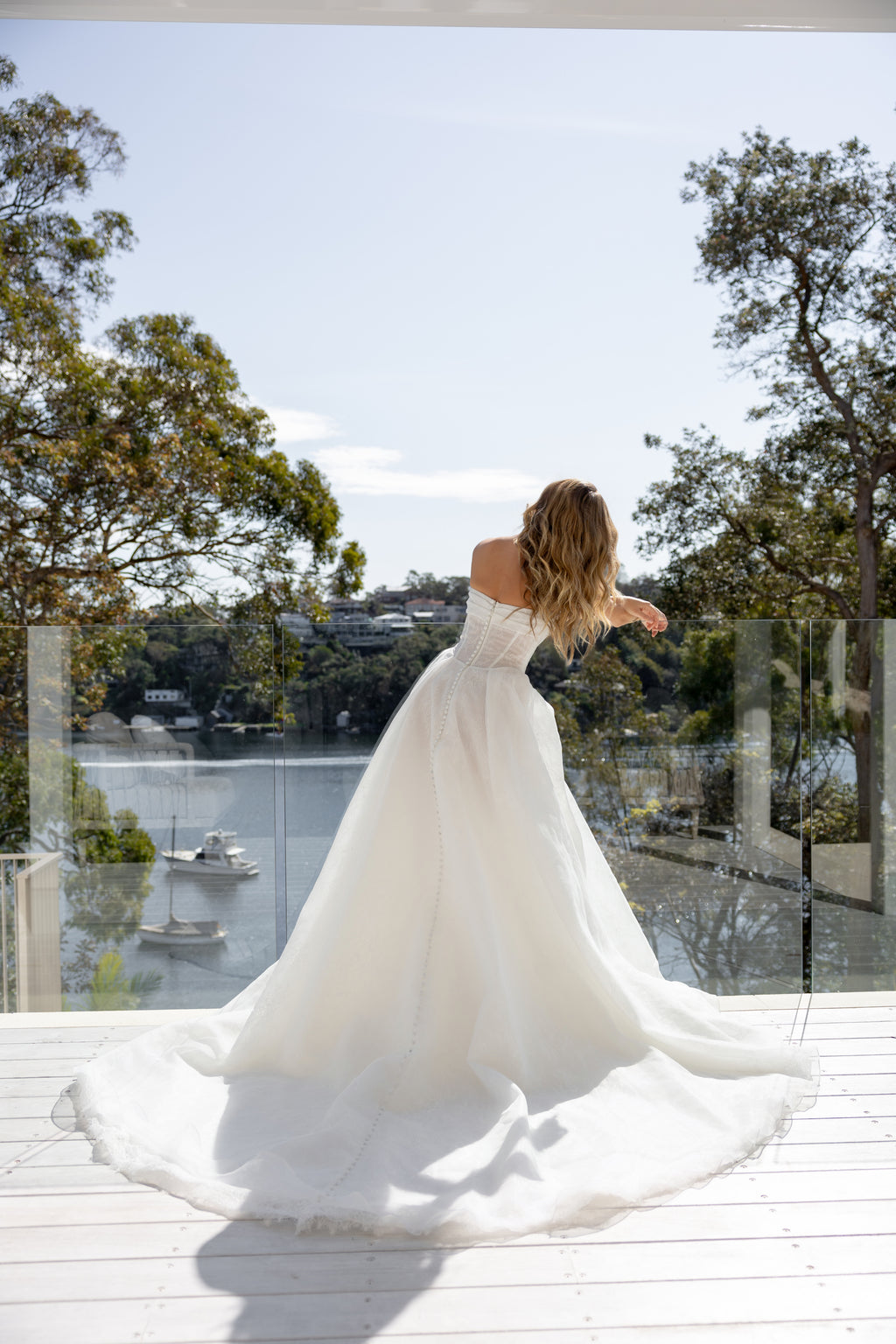 Crafted from fine Chantilly lace and glazed over with an airy layer of organza, 'Ava' is a playful take on the A-line silhouette, featuring an asymmetrical skirt for added volume. The folded corset bodice offers a flattering balance of structure and sensuality. Running through the heart of the gown, a trail of dainty buttons cascades from bodice to hem, lending a timeless bridal design to this modern gown.