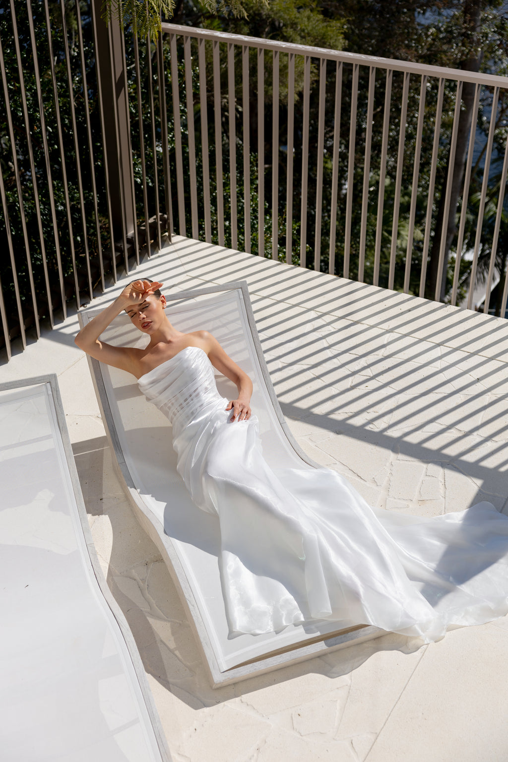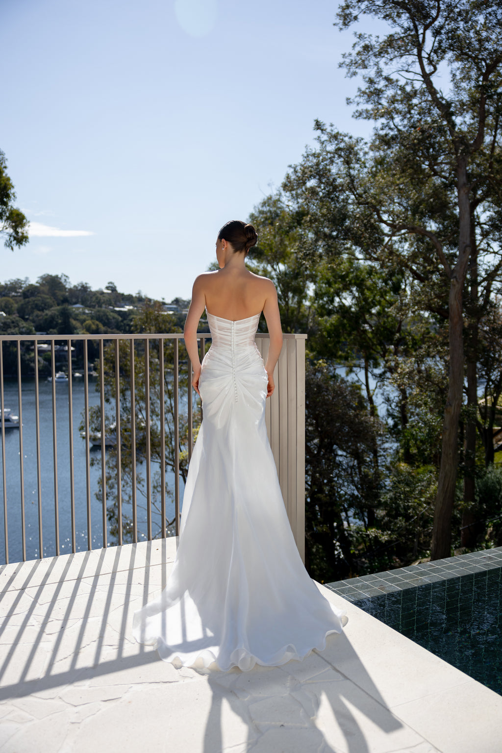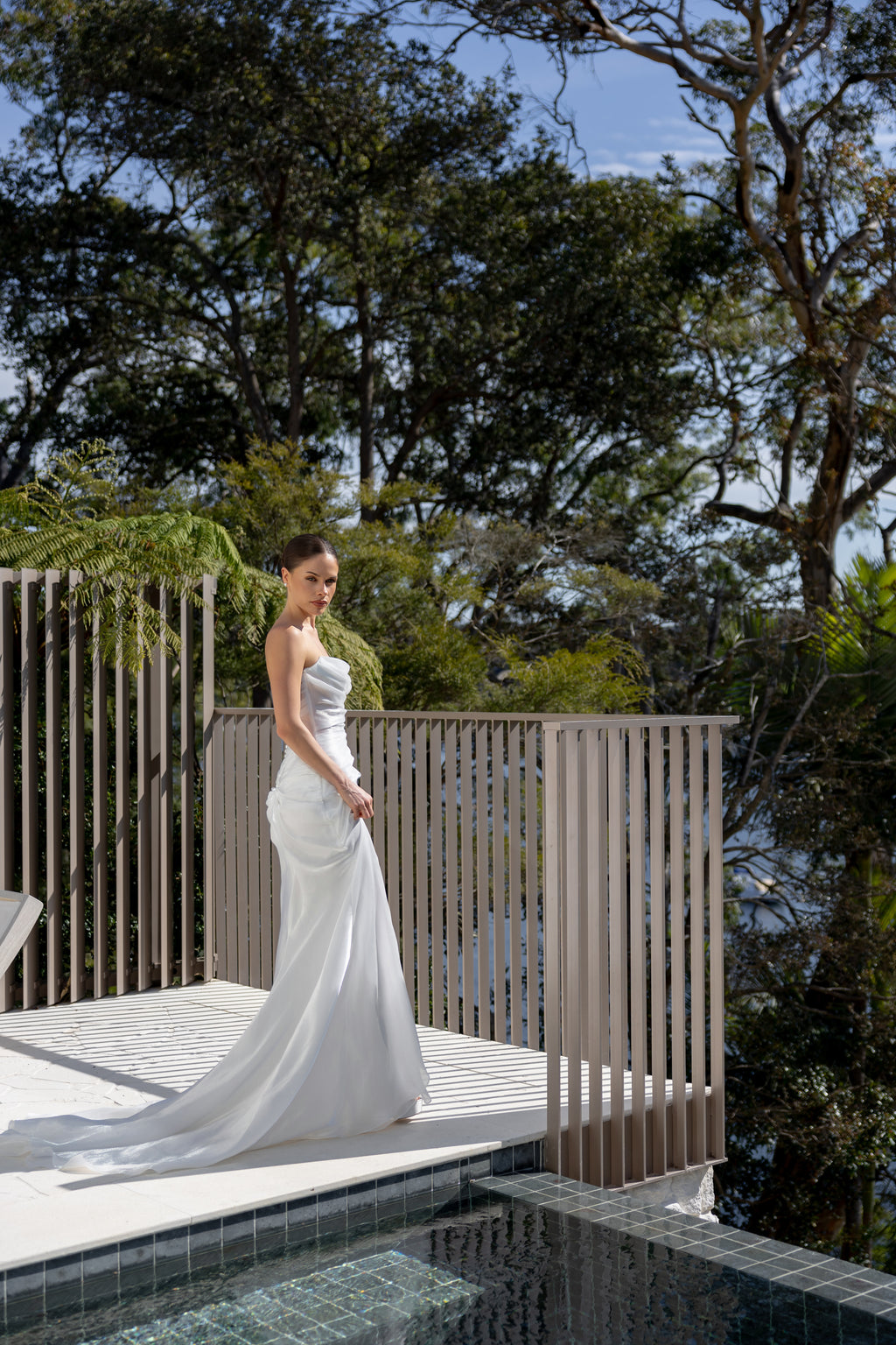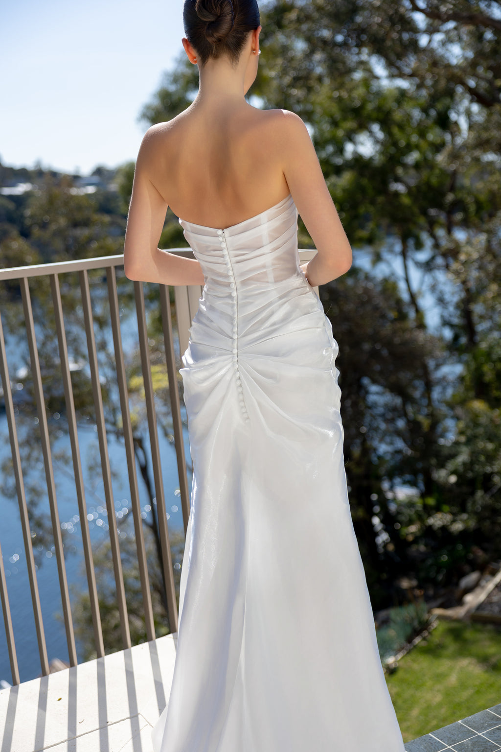 'Heidi' is a vision of artistry, sculpted from silky-smooth pearlescence organza that captures the light with every movement, creating a luminous, ethereal glow. Her drapery hugs you in all the places, turning your silhouette into shimmering liquid gold. The strapless bodice is artfully sculpted, featuring exposed boning that contours the torso, while the sheath skirt effortlessly pools into an understated train.