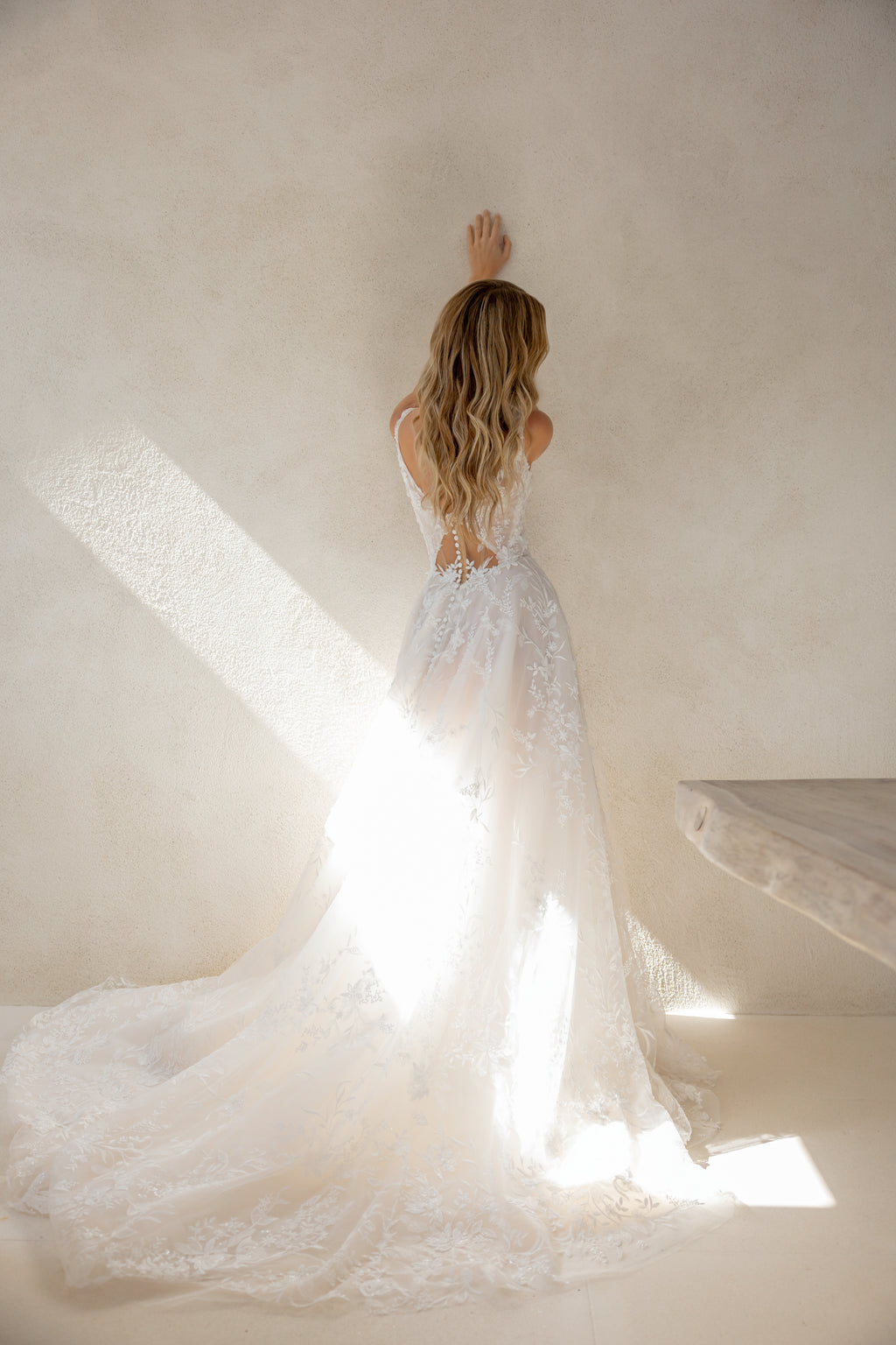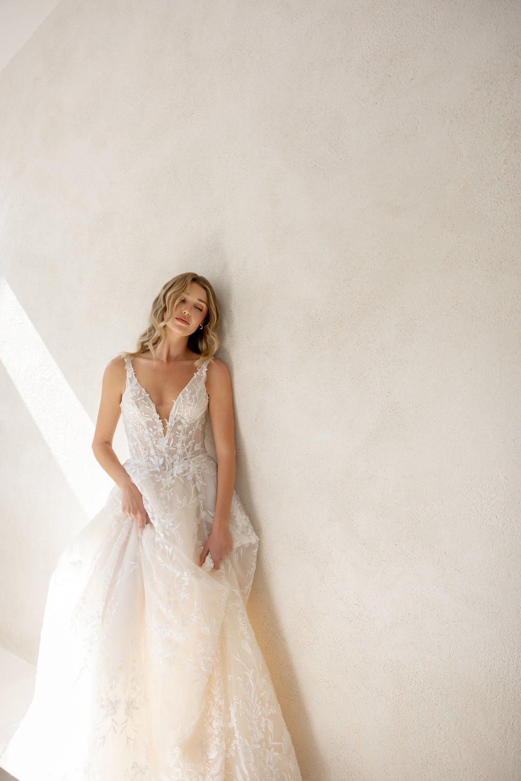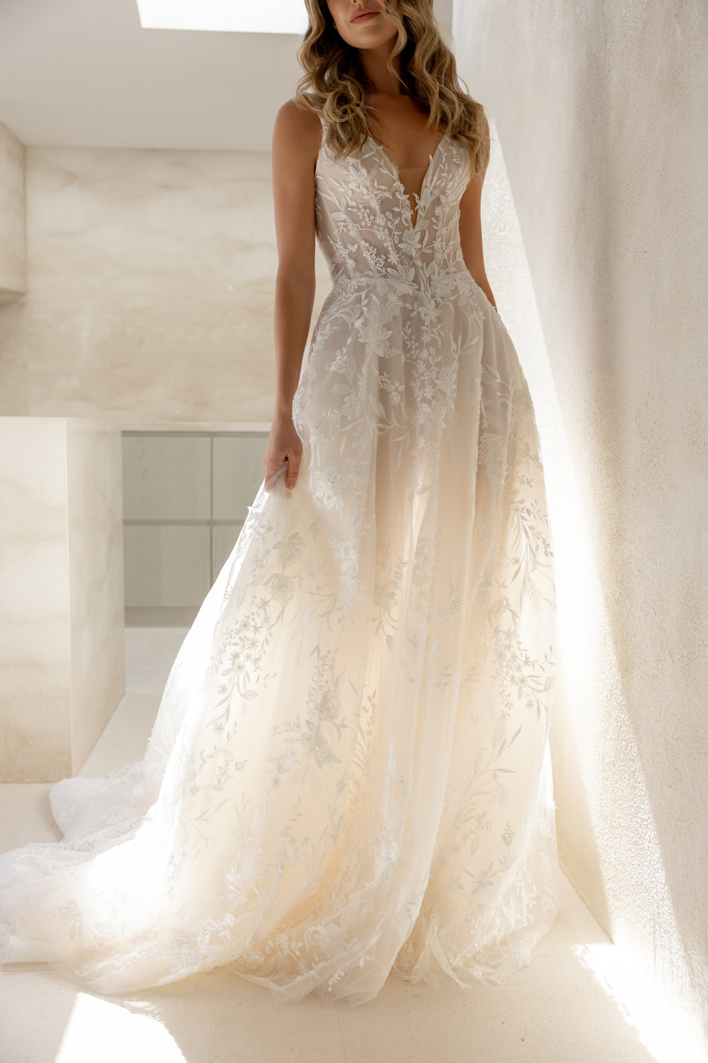 Enchanting and poetic, 'Lyric' is a truly feminine gown. Delicate 3D botanical lace blooms organically down from the supportive Deep-V plunge neckline onto the soft A-line silhouette, enveloping the body as they meet at the diamond-cutout back; a unique detail that makes this whimsical gown a romantic masterpiece. Layered tulle, softened by its barely-there soft nude undertones, float with every movement.