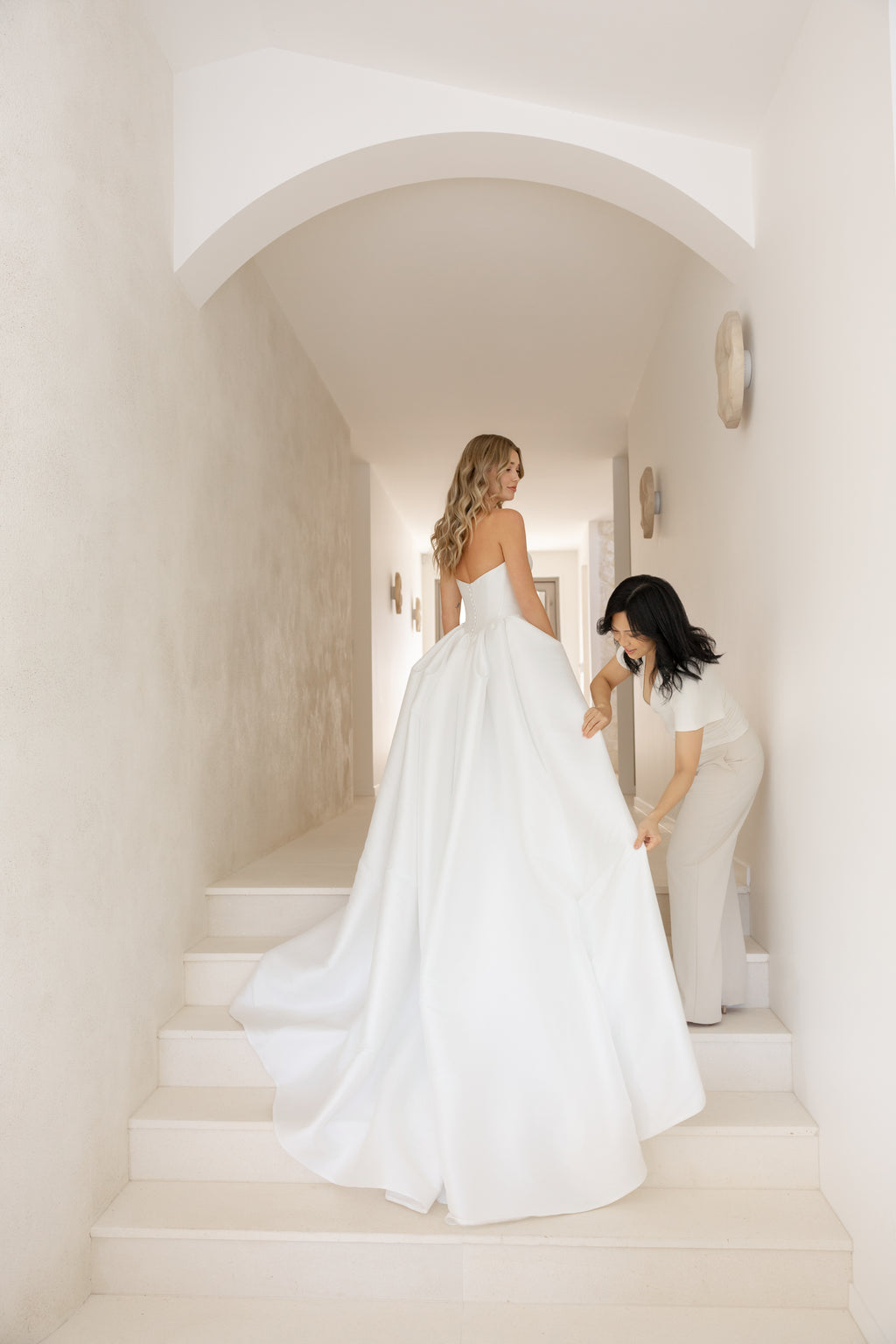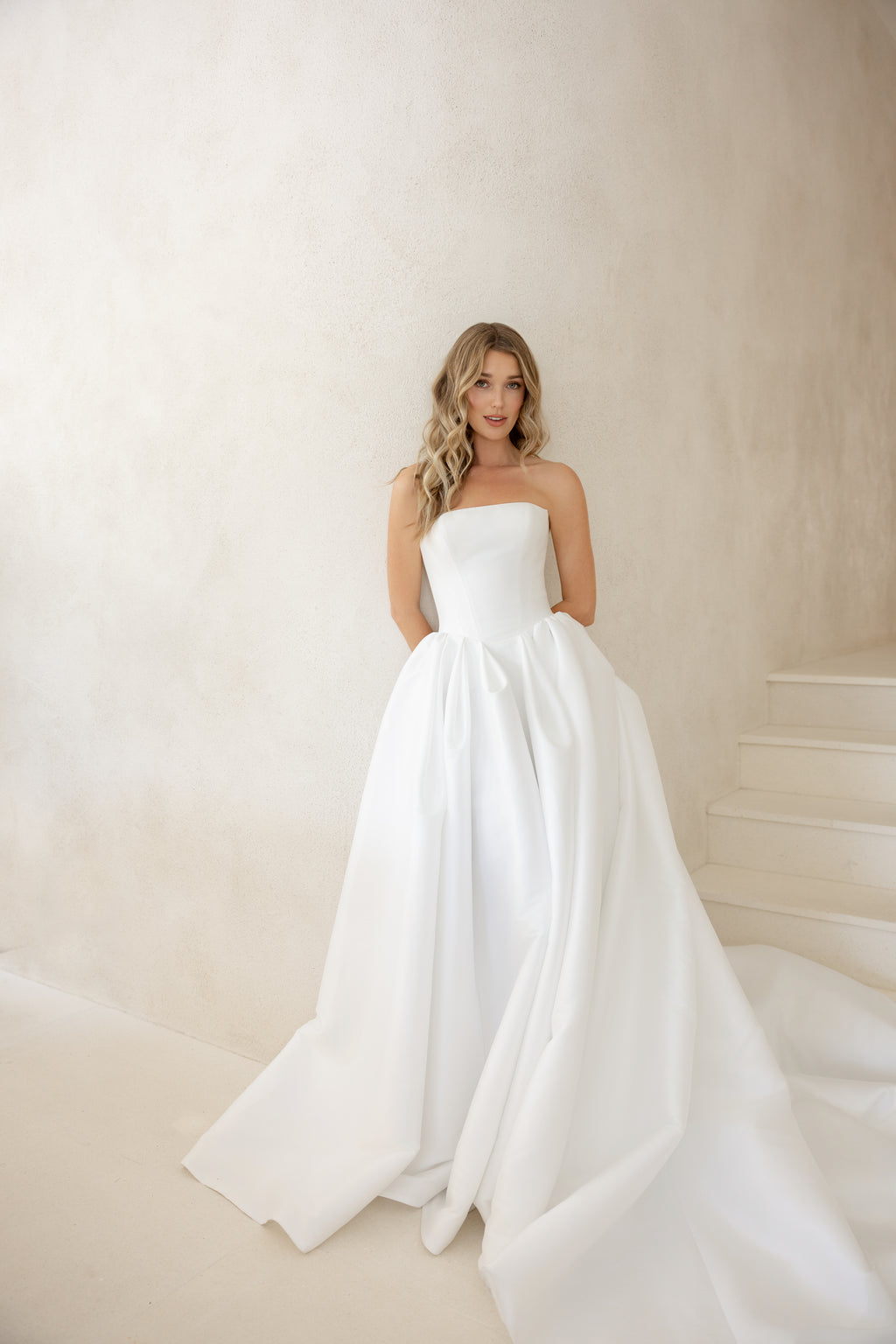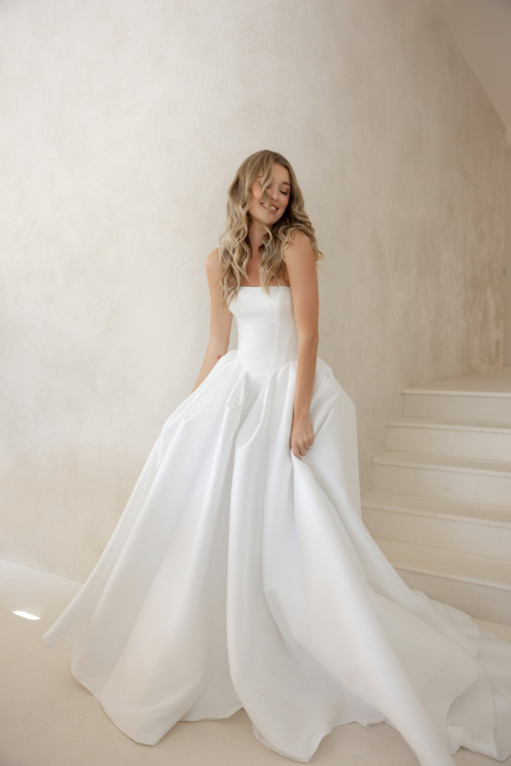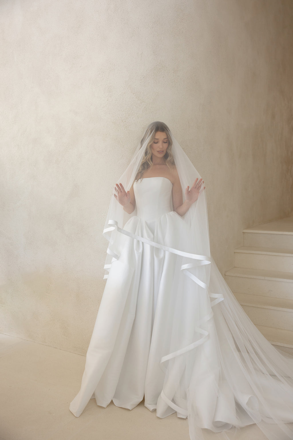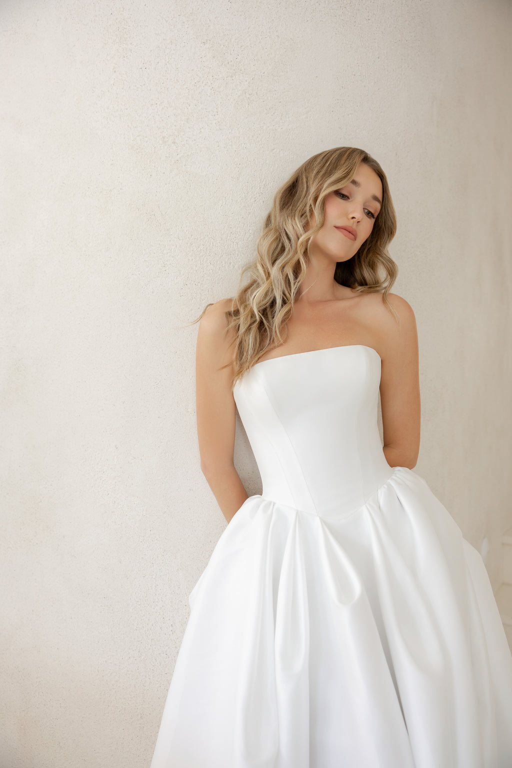 Fit for the modern-day Princess, Riley is every bride's dream. Her strapless corset bodice is sleek and sculpted, hugging the body effortlessly before melting seamlessly into a basque waist. Through masterful gathering, layering, and pleating of her structured Satin fabric, the skirt billows outward in soft yet commanding waves; creating a sense of movement even in stillness. Pair her with a matching two-tiered, satin-trim veil for a completed romantic look.