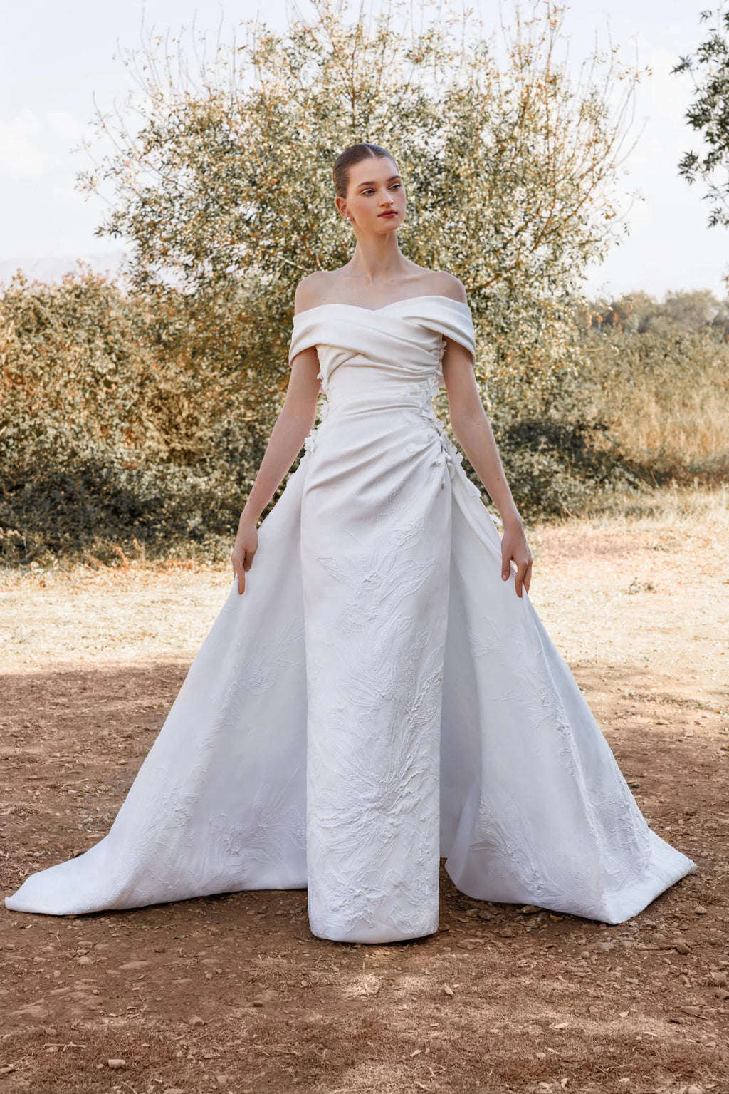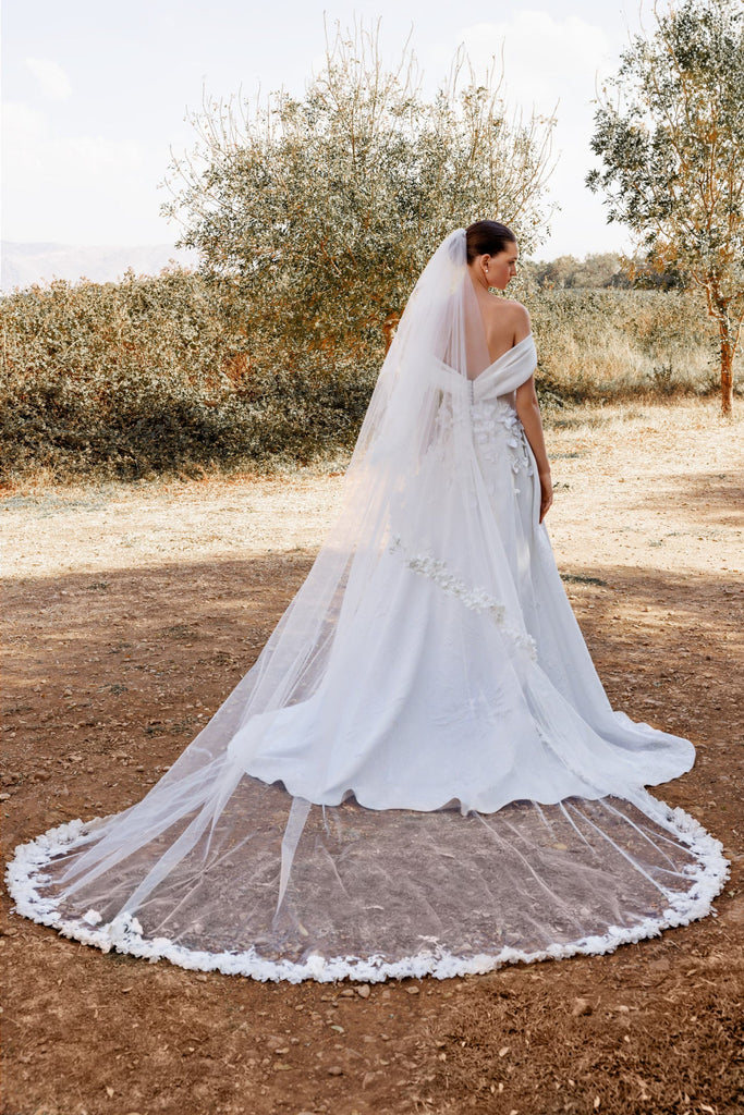 A captivating off-white off-shoulder brocade dress, adorned with meticulously crafted 3D flowers on the sides of the bodice. The design is accentuated with delicate small 3D flowers and shimmering sequins for added allure. The dress features a brocade overskirt, elegantly cascading with 3D flowers flowing down into the skirt. It is paired with a 3 meters embroidered veil bordered with 3D flowers.