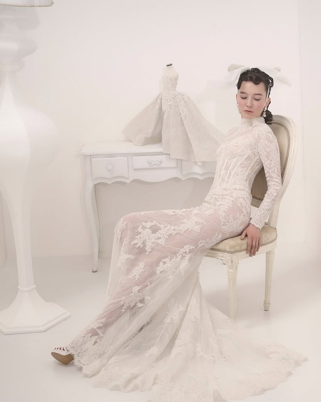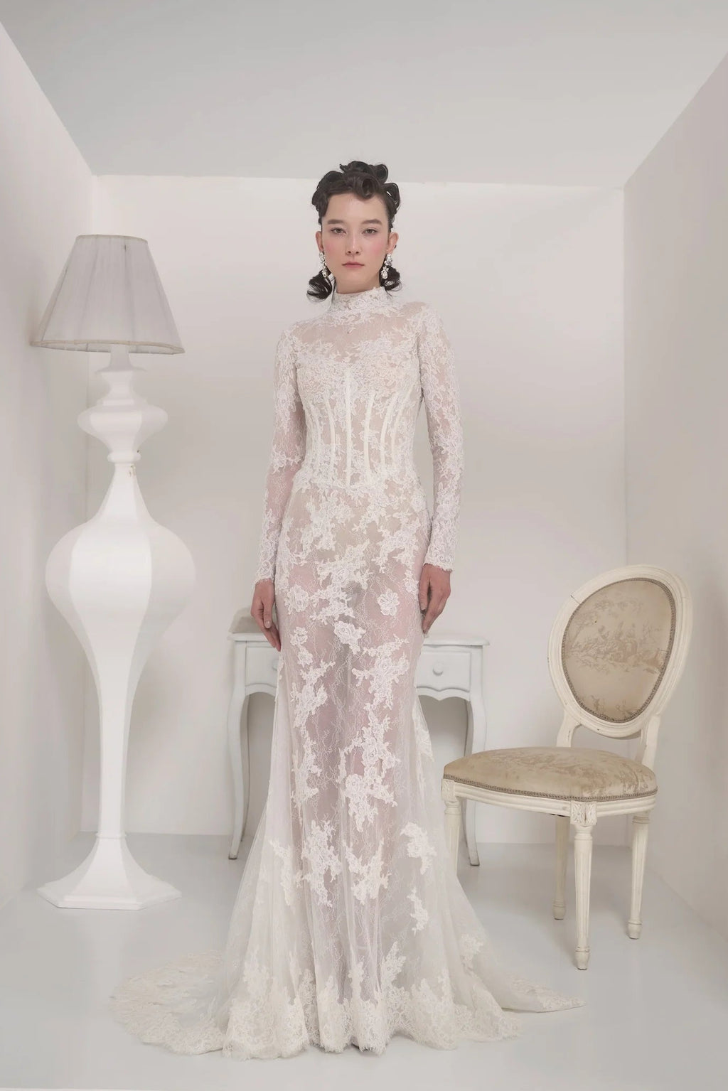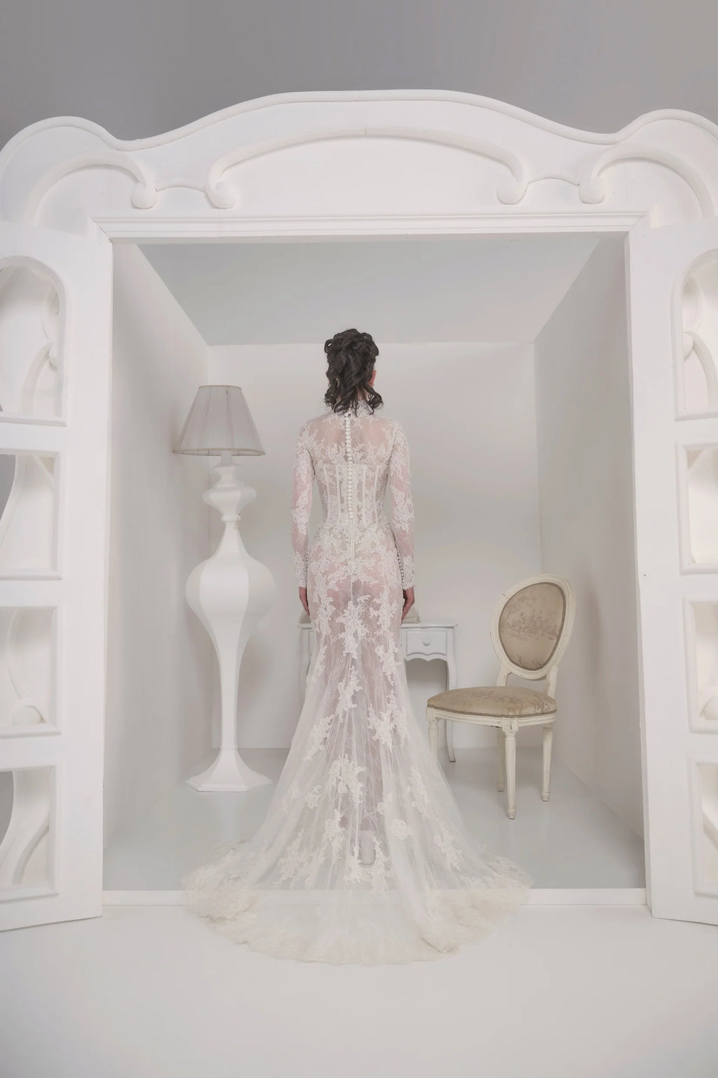 A romantic off-white tulle lace fitted dress featuring a high neckline, long sleeves, and a beautifully crafted corset that enhances its elegant silhouette. The look is completed with a matching 3-meter veil, delicately bordered with lace for a timeless and sophisticated finish.