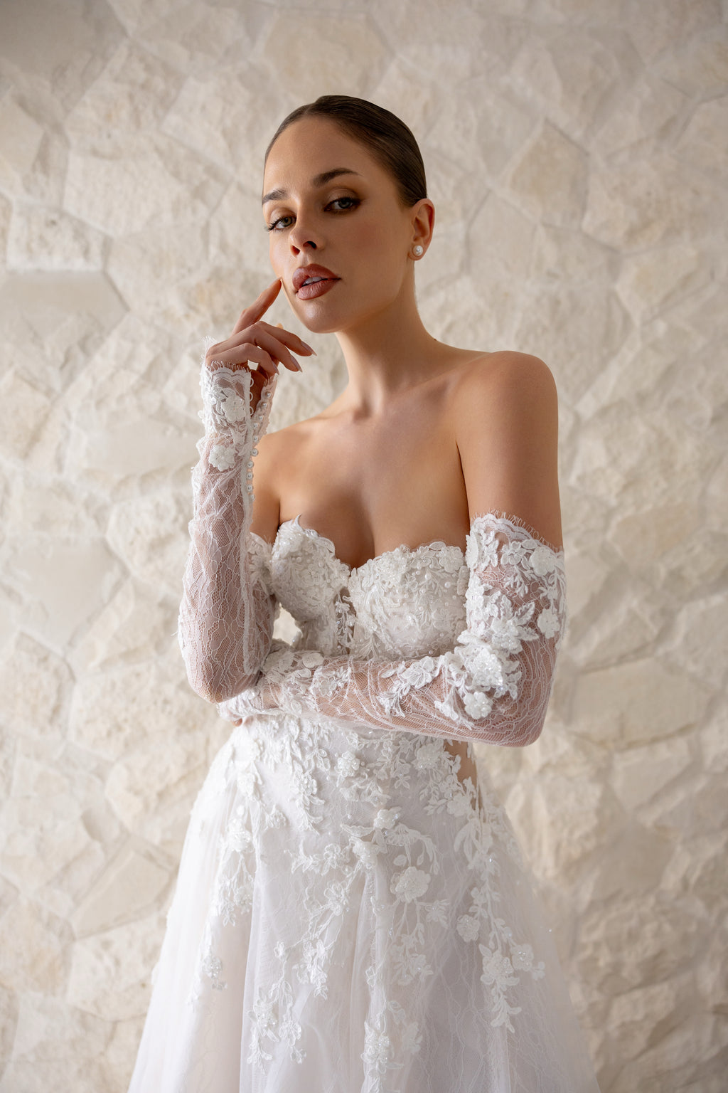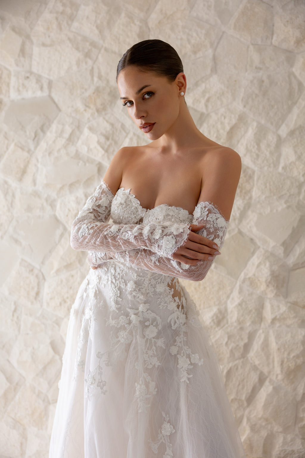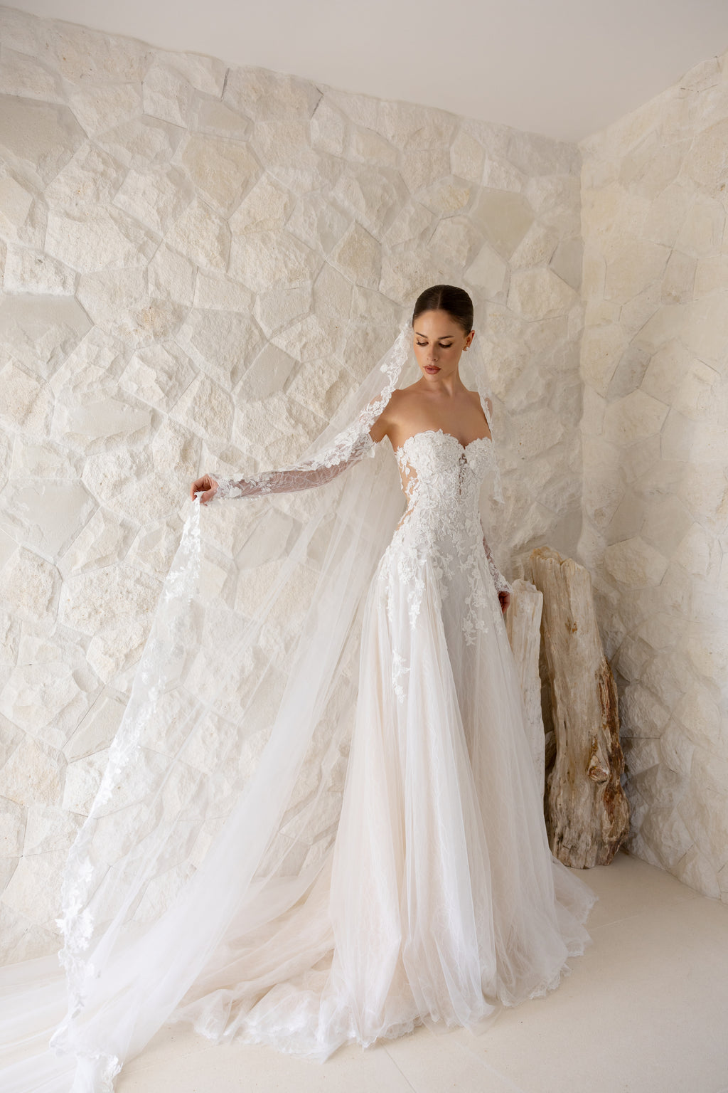 For brides who adore ethereal romance with whispers of sultriness, 'Blossom' is the perfect choice. Dramatic side cut-outs gently curve around to the back, creating an alluring figure on this drop-waist Aline gown. While the delicate lace appliqués that adorn this masterpiece are paired with layers of chantilly lace and soft tulle, giving the gown an airy, dreamlike quality as you move. Style her with matching lace sleeves and a veil to complete your enchanting and unforgettable bridal look.