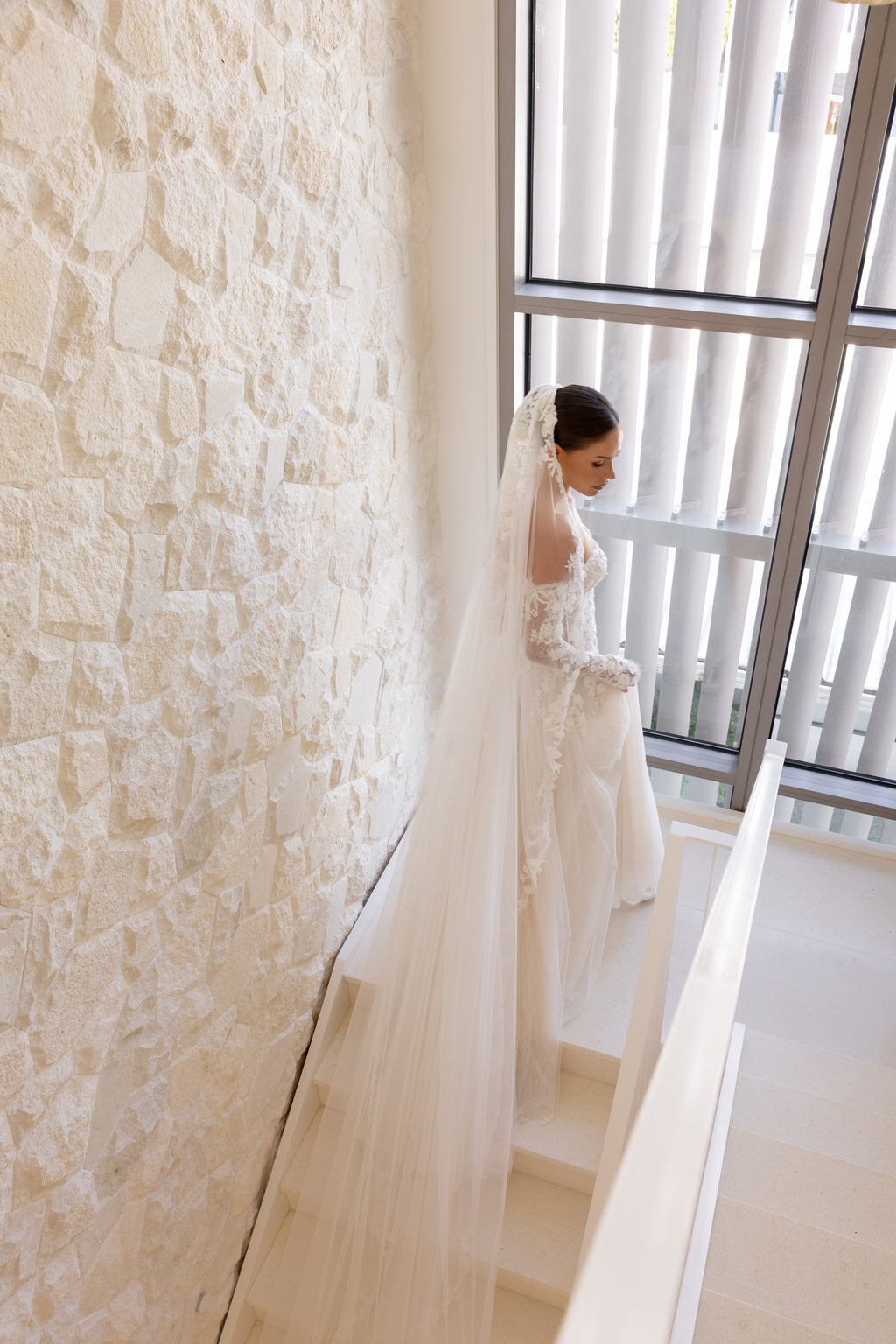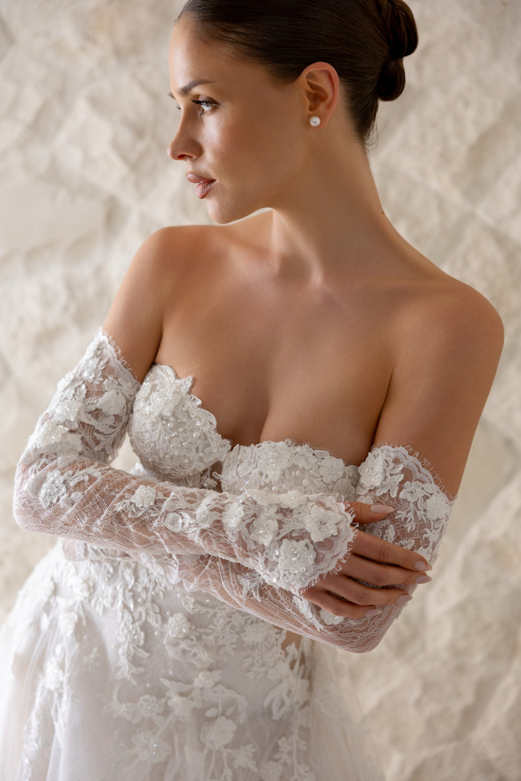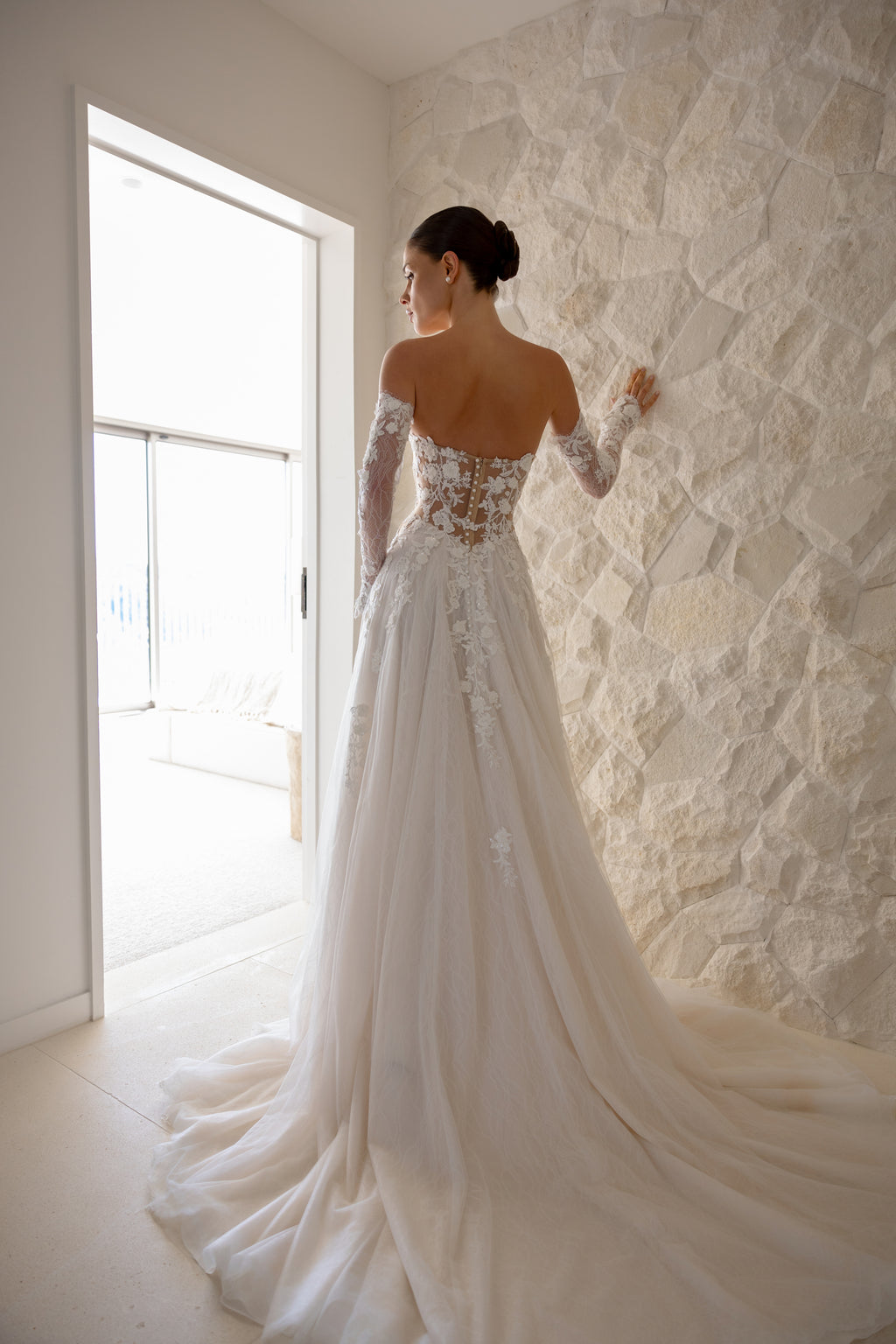 For brides who adore ethereal romance with whispers of sultriness, 'Blossom' is the perfect choice. Dramatic side cut-outs gently curve around to the back, creating an alluring figure on this drop-waist Aline gown. While the delicate lace appliqués that adorn this masterpiece are paired with layers of chantilly lace and soft tulle, giving the gown an airy, dreamlike quality as you move. Style her with matching lace sleeves and a veil to complete your enchanting and unforgettable bridal look.