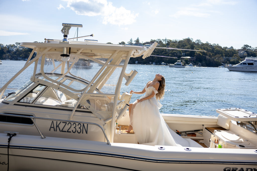 'Cassidy' treads a delicate balance between glamour and ethereal romance, with her beaded sweetheart corset that glimmers with light-catching embellishments and flowing aline skirt where layers of feather-light tulle create a sense of airy movement. An architectural peplum trim nods to Victorian elegance, while the detachable straps make this captivating gown versatile for the modern bride.