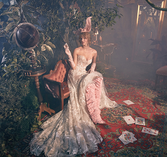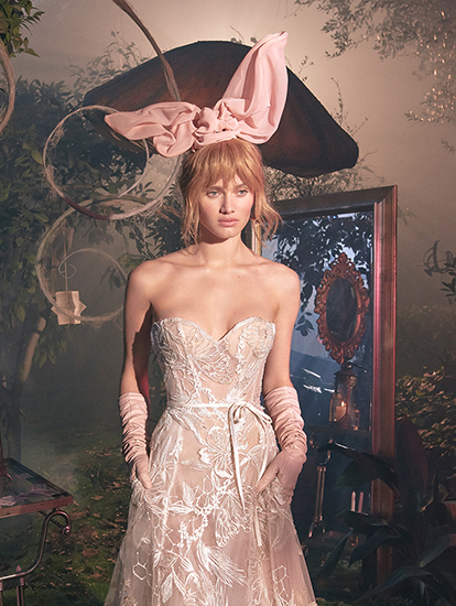 Sheer strapless A-line gown made with a geometrical floral embroidery. Featuring two-toned bridal tulle in shades of blush and ivory. The skirt has hidden pockets with a delicate silk bow sash accent and a chapel length train. Wedding dress from GALA by Galia Lahav 'GALA no. 8' collection.