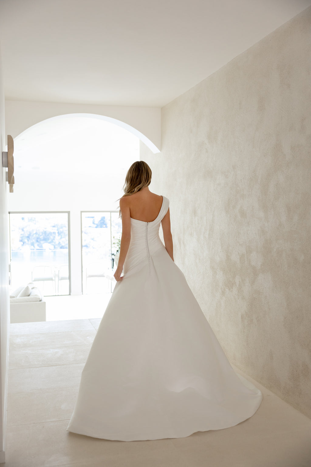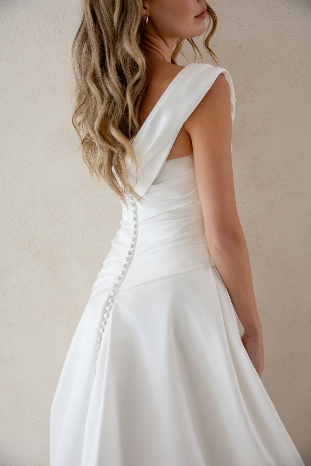 In an ode to Grecian artistry, 'Claire' has been crafted from smooth ivory Satin that sweeps across the bodice in architectural lines, creating a sense of fluidity. Each pleat is deliberate yet organic, hugging the figure with delicate precision. Her asymmetric neckline adds modern drama as a single strap rises gracefully over one shoulder. The daring high slit reveals a hint of skin to soften this simple yet sophisticated design, paired perfectly with a delicate tulle veil.