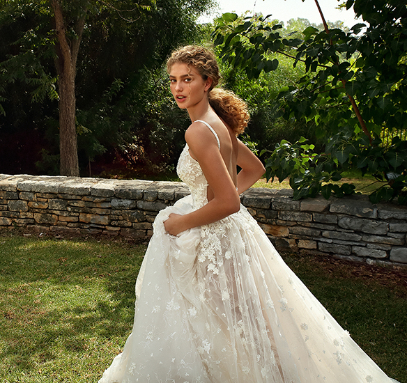 Ball gown wedding dress in 3-D embroidered tulle with plunging 'V' neckline. Features low scoop back in illusion mesh, embellished floral bodice and dainty 3-D flowers scattered on the voluminous skirt. Wedding dress from GALA by Galia Lahav 'GALA no. 7' collection.