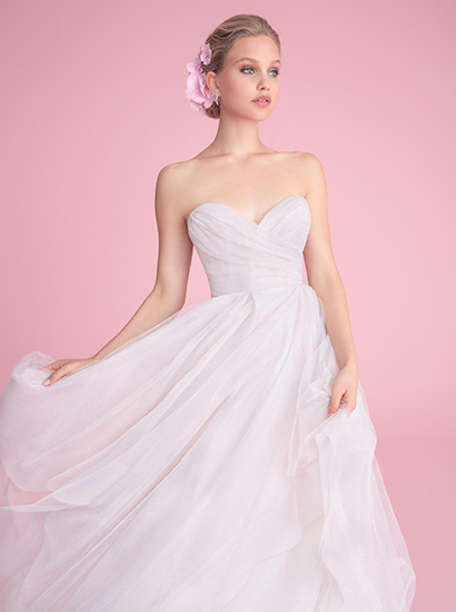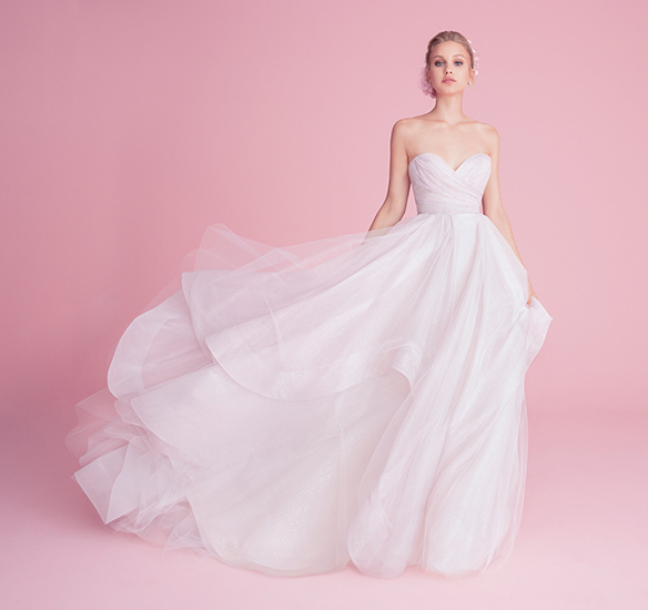 Ballgown wedding dress in sparkle tulle with sweetheart neckline. Features a draped bodice, 'V' back and invisible zipper closure that flows into gathered cascading shimmery tulle skirt with wide horsehair edging. Wedding dress from Blush by Hayley Paige.