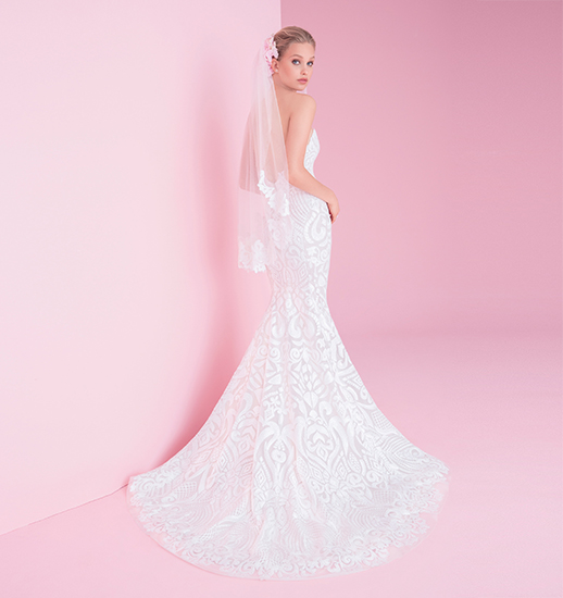 Fit and flare wedding dress in Marrakesh sequinned tulle with sweetheart neckline. Features bold pattern all over, classic high 'V' back with invisible zipper closure, hugging the hips and flares out into a rounded train in chapel length. Wedding dress from Blush by Hayley Paige.