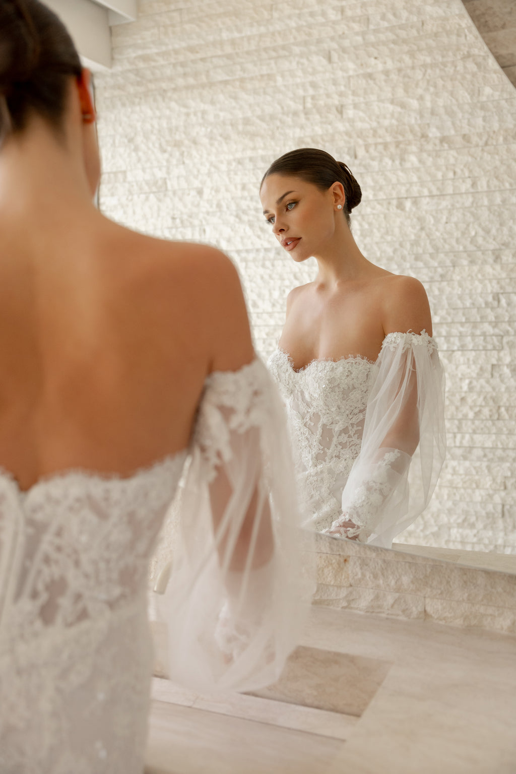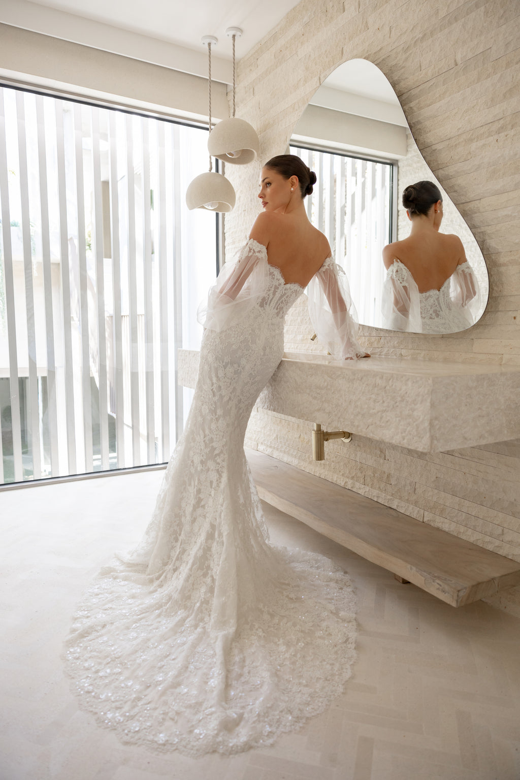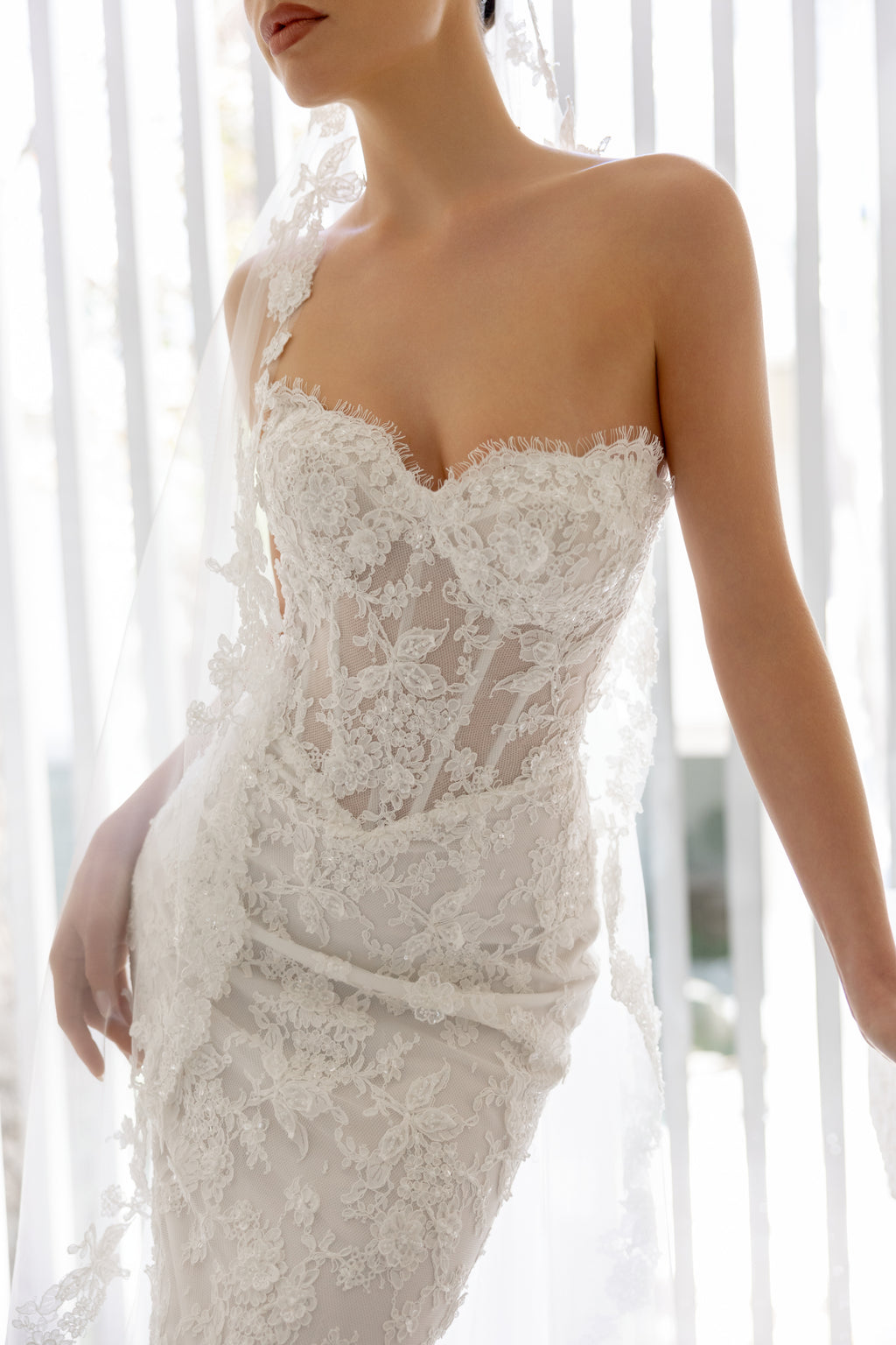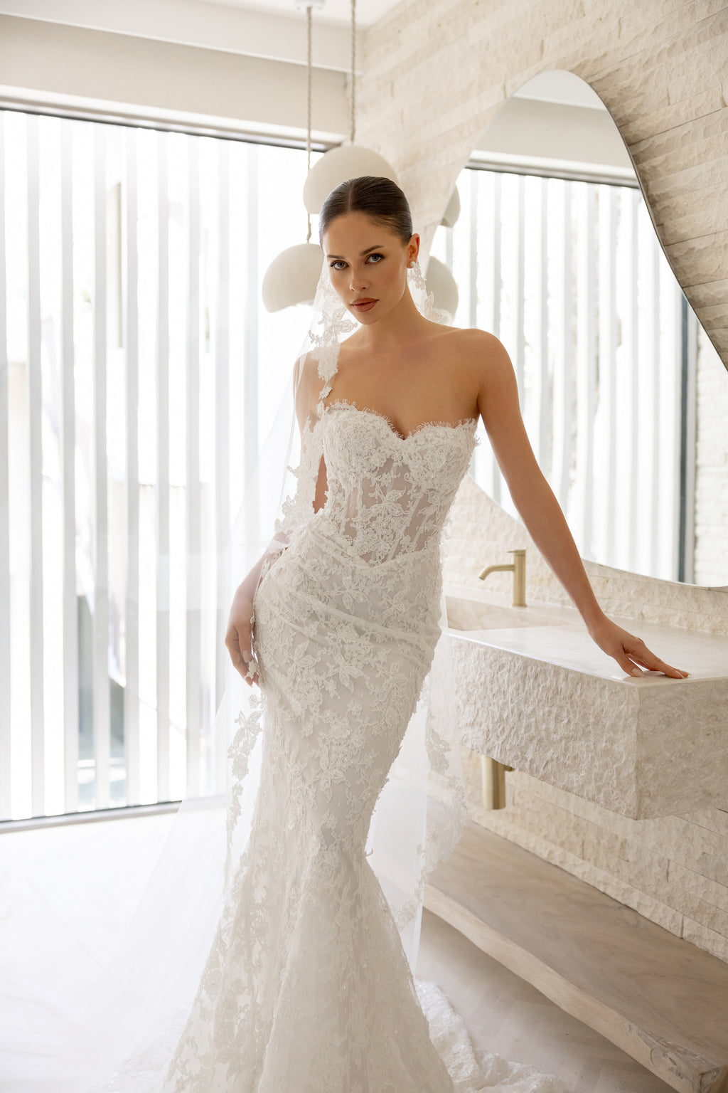 Romance is in full bloom with 'Theadora' as she celebrates the art of corsetry and femininity with a sweetheart bodice and gracefully contoured basque waist. Detachable tulle lantern sleeves add bohemian magic, trimmed with the same beaded lace that cascades down the gown's captivating mermaid silhouette. Style her with a matching lace-trim veil for an enchanting bridal look.